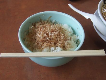 久しぶりにいただく丸信のこってりは、相変わらず、背脂が浮いた醤油が濃いスープに、中太のモチモチした麺が旨いですね。一見ハードな醤油味スープも食べ進むうちにじんわりと甘みが感じられ、また、上に載るラー油で和えたような感じのネギの風味が徐々に加わってきて、これが何とも。途中から、卓上には置いてありませんが店員さんに言えば持ってきてくれるニンニクを投入すれば、これもよく合っていて。最後は、残ったスープをおかかライスにぶっかけて締め。ライスの上に載ったおかかの香りと味が、スープの味に加わって、たまりませんね。