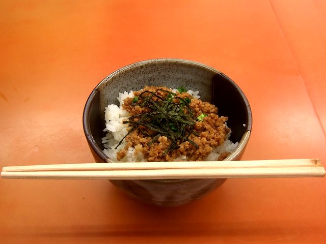 すっかりと前置きが長くなってしまいましたが、その、濃厚プレミアム塩とんこつ。早速スープをいただいてみると、「え?」「濃厚」などと付いてるものだから、てっきり、例の匂いがギンギンにする山岡家のスープの、更に濃いバージョンを想像していたのですが、実際にいただいてみると、まるで、この辺りでいただく九州ラーメンの豚骨スープのような味で、少々拍子抜けしてしまいました。背脂は結構入っているのですが、それほどしつこくなく、(山岡家にしては)サラッとした印象です。また麺は、ノーマルの麺より色が黄みがかって若干細いように見えたのですが、山岡家のウェブサイトの、濃厚プレミアム塩とんこつのページには麺について特段の記載がないので、ひょっとしたら気のせいかもしれません。(提供された時のノーマルのラーメンとの時間差についても、それほど大きな差はなかったので。)そして具は、チャーシューと穂先メンマと、たっぷりの青ネギ。チャーシューはノーマルのチャーシューとの違いは感じられず(同じもの?)、穂先メンマは独特の香り(発酵臭?)が結構強かったです。ただ、青ネギが沢山入るのはいいですね。スープの味が九州ラーメンっぽいこともあって、大変に合っていると思います。それから、セットのそぼろ丼は、上に載ったそぼろの香りが、ちょっと独特(アニマル系?)。ニンニクと豆板醤を載せ、ラーメンのスープをかけていただくと、普段の山岡家の汁かけ飯とは違った感じでいただけました。