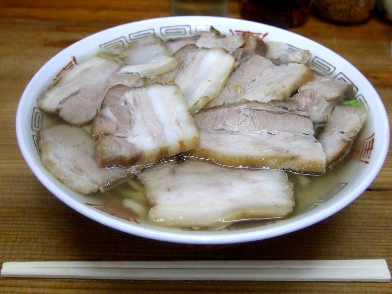 ほどなくして登場した肉そばは、薄い黄金色のスープがなみなみと注がれ、写真を撮ろうと丼を動かしただけでカウンターにスープがこぼれます。(特に、今回座った奥のカウンターは、若干手前側に傾いているので、余計に…。)そのスープを、さらにこぼさないようそっと一口啜ってみると、記憶にあるのと同じ、『豚』と『塩』と若干の『粉』の味。油っ気はほとんどなく、塩気(というか、塩)は結構強く、また、タレやスープの味も複数の素材が複雑に絡み合ったような押し出しの強い味ではないんですが、このシンプルな味が、逆に奥深いというか、何ともいいんですよねぇ。また麺は、ちょっとすいとんを連想させる、もちっとした食感の、縮れの付いた太めの平打ち麺。この麺の小麦粉の風味が僅かにスープに溶け込んで、それがまた個性になっているような気がします。そして、坂内食堂の肉そばと言えば、丼一面を埋め尽くすチャーシュー!トロッと溶けるようなタイプではないんですが、サクっとした歯応えと、噛み締めた時の肉の旨味と脂の甘みがたまりませぬ。で、今回肉そばをいただいてみて思ったのですが、前回訪問時にいただいた支那そばと較べ、これだけ大量のチャーシューが入ることによって、チャーシューの脂と醤油の風味が、食べ進むうちにスープに溶け込んで、ラーメン全体の味に微妙に変化をもたらすというか。(今回改めて同行者が食べた支那そばと比較しましたが、やはりそう感じました。)また、提供されるメニューが基本的にラーメン類のみにもかかわらず卓上の調味料は豊富で、白コショウの他、七味、ラー油、お酢が置いてあって、そのどれを入れても、ラーメンの味がシンプルな分、それらの個性が感じられる味になります。(個人的には七味とお酢が気に入りました。)