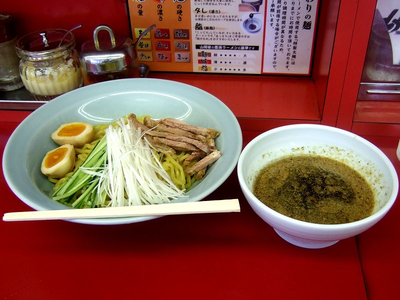 それでいただいたのが、山岡家で現在やっている『つけ麺祭り』の第三弾、冷やし風つけ麺です。で、公式ウェブサイトによれば、「猛暑の季節には冷たい麺がピッタリ。冷やし中華をアレンジして、つけ麺を作ってみました。」ということなんですが、実際にいただいてみると、「確かに。」と納得。何ていうか、今回のつけ麺祭りで共通して?使用している太めの麺で、タレ(甘くて酸っぱい醤油ベースのごくごくノーマルなもの)を別添え=つけ麺っぽくいただける冷やし中華を作ってみました、みたいな。