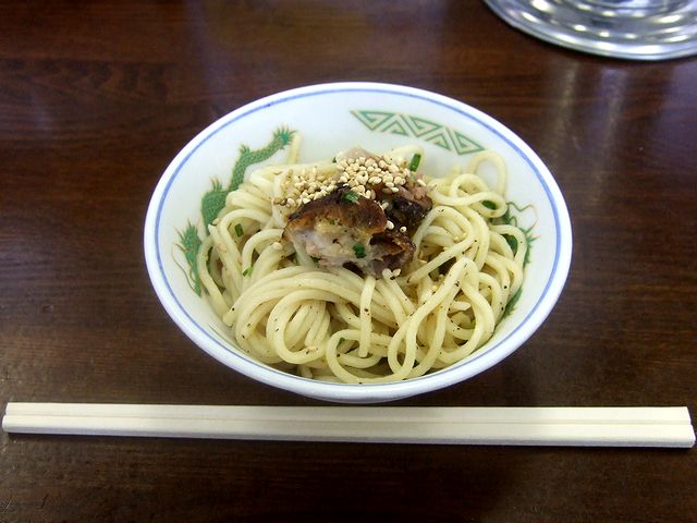 それでまずは登場した、こちらの品から。早速いただいてみると、茹でた麺をニンニク風味のゴマ油で和え、チャーシュー、青ネギ、白ゴマをあしらったような感じです。麺はまとめて茹でて味付けしてから冷やしてあるようで、茹で置きした麺の食感が、いかにも『まかない』っぽい感じ。何となく、給食に出された麺料理を思い出してしまいました。結構美味しかったですよ。