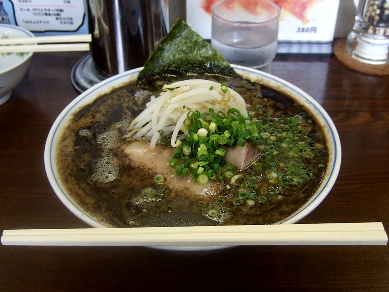 次に登場した小振りの丼で登場したラーメンは、黒々としたマー油、細めのモヤシが熊本発祥のラーメンであることを主張する見た目ですね。まず、カウンター上に置かれたこちらのラーメンの食法の案内どおりに麺から啜れば、中細ストレートの麺にマー油が絡んで、のっけからインパクトのあるお味。次にスープを啜れば、コクのある豚骨スープにマー油が混ざり合って、これまたインパクトのあるお味。この、ディープローストなマー油の味と香りが、ものすごく強烈な個性を放っていますねぇ。でも、食べ進むうちに、インパクトがあるだけではなく、ベースとなっている麺もスープも、とてもしっかりとした作り込みを感じました。特にスープは、豚臭さや雑味などは感じられず、濃厚だけども、なんともまろやかなお味。具のチャーシューもお肉の美味しい味がしっかりと感じられ、細めのモヤシの歯応えとサッパリ感もいいですね。いやぁ、さすがに人気店の看板メニュー。美味しゅうございました。
