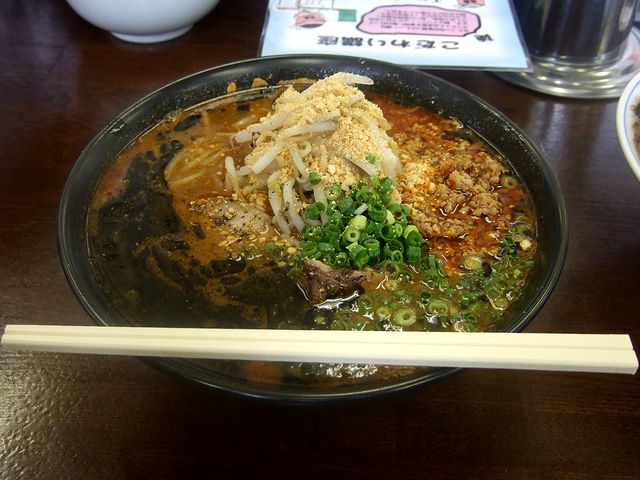 こちらは、同行者がいただいたもの。注文の際、恥ずかしさを堪えて「猛烈タンメン鼻血ブーを」と言ったら、店員さんはあっさりと、「辛味噌らーめんですね」と。で、よくよくメニューを見てみたら、『辛味噌らーめん猛烈タンメン鼻血ブー』と書いてありました…。それはさておき、少々味見させていただいたのですが、スープはマー油と山椒を始めとするスパイス類、ナッツ(ピーナッツ?)、挽肉などが複雑に絡み合って、インパクトはあるけど何とも深いお味で旨いです。 お腹に余裕があれば、きちんといただきたかったなぁ。