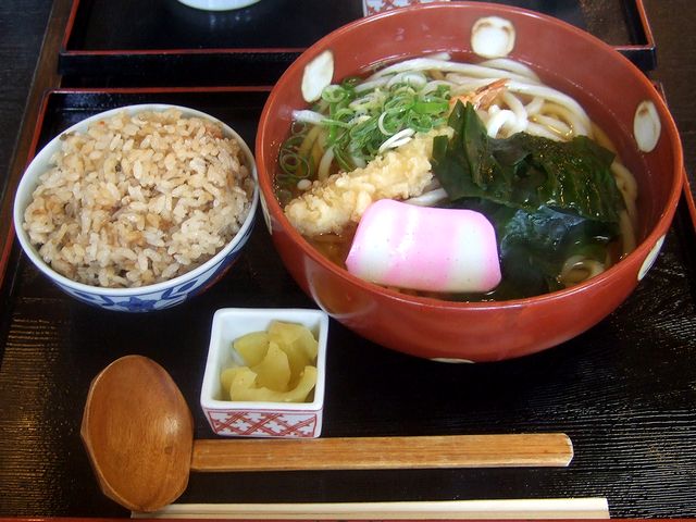 こでいただいたのは、ランチメニューである、えび天うどんとかやくごはんのこちらのセット。まずうどんは、関西風のだし汁に、コシの強い麺。そこにえび天とワカメ、かまぼこが入っているのですが(見たまんまですね…。)天ぷらとワカメって、意外と相性いいと思うのですが。それをかやくご飯と共にいただけば、ボリュームもあって満腹でございます。お値段もお手頃で、いいんじゃないでしょうか?