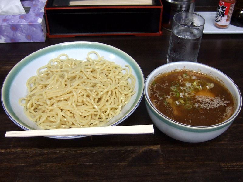 それで今回お伺いしたこの日は平日だったのですが、開店約30分前の午前11時には既に何人か開店待ちが。やがて開店時間直前に店員さんが出てきて、人数を確認しつつ整理券を配っていきます。そしてようやく開店となり、順番に入り口の所にある券売機で食券を購入しますが、せっかくなので、今回は具「全部乗せ」というべきつるやつけ麺の食券を購入し壁沿いのカウンター席へ。席に着いた人から順番に、店員さんが食券を回収していきますが、皆さんほとんどがつけ麺かつるやつけ麺のようでした。そして、食券を回収されてから待つこと暫しで登場。当ブログでは初めて、こちらのつけ麺をいただける時がやってきました。