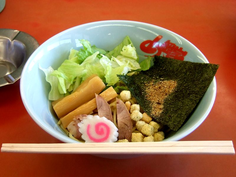 2つ同時に来たためどちらからいただこうか迷いましたが、とりあえず、両方ともよく混ぜ混ぜして、まずは、「海」のほうから。実は、汁無しラーメンというものをいただくのは初めてだったんですが、茹でられて湯切りされた麺がそのまま丼に入っているためか、ちょっとヌルヌルしますね。そのヌルヌルした麺に、豚骨魚介風味のタレと節粉が絡んで、お味のほうは結構美味しいです。また具は、短冊切りのレタスやチャーシュー、太めのメンマ、スライスされたナルト、海苔の他、クルトンが載ってました。