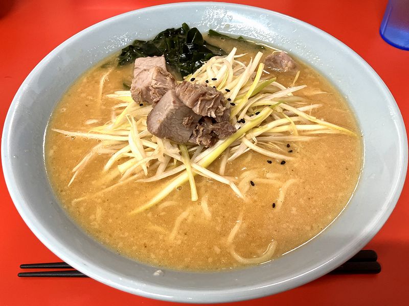 それで今回いただいたのが、赤味噌ネギラーメンに半ライスを添えて。こちらの味噌系メニューは「白味噌」と「赤味噌」の2種類有るのが特徴的ですが、こんな状態のなので、よりエッジが効いてそうな赤味噌をチョイスした次第。