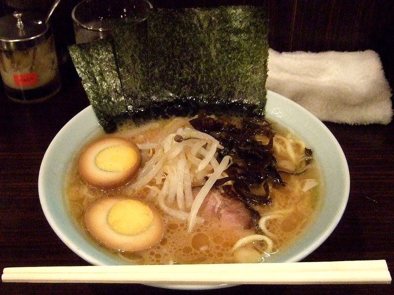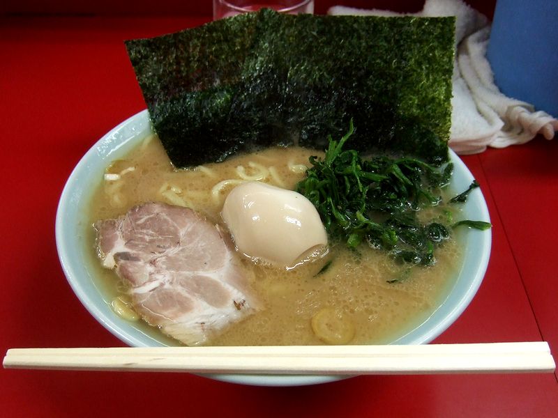 注文して程なくすると、目の前の厨房でお兄さんたちが威勢良く作ってくれたラーメンが登場しました。家系ですが、上に載るのは青菜ではなく、モヤシとキクラゲというのが珍しいですね。それでまず、スープからいただくと、「あ、旨い。」何て言うか、家系ですが軽い飲み口で、旨味も充分に出ています。しばらくそのままいただきましたが、せっかくなので、豊富に揃った卓上の薬味を入れてみましたが、その中でも、ピリカラにんにくが個人的には気に入りました。(だからお腹が…。)また麺は、家系ではおなじみの酒井製麺製ではない(カネ??製)ようです。茹で加減固め指定にしなくてもやや固めの茹で上がりで、啜るとズルっとした感じで、噛むとややモチっとしてブツって切れる食感。具のチャーシューは固めでドライな食感ですが、海苔は香ばしく、モヤシとキクラゲは結構合っていますね。そして、追加の煮卵は、今時流行りの半熟タイプではなく固茹でタイプですが、黄身はホクホクとした食感で、濃い目ながらも甘味を感じる味付けです。
