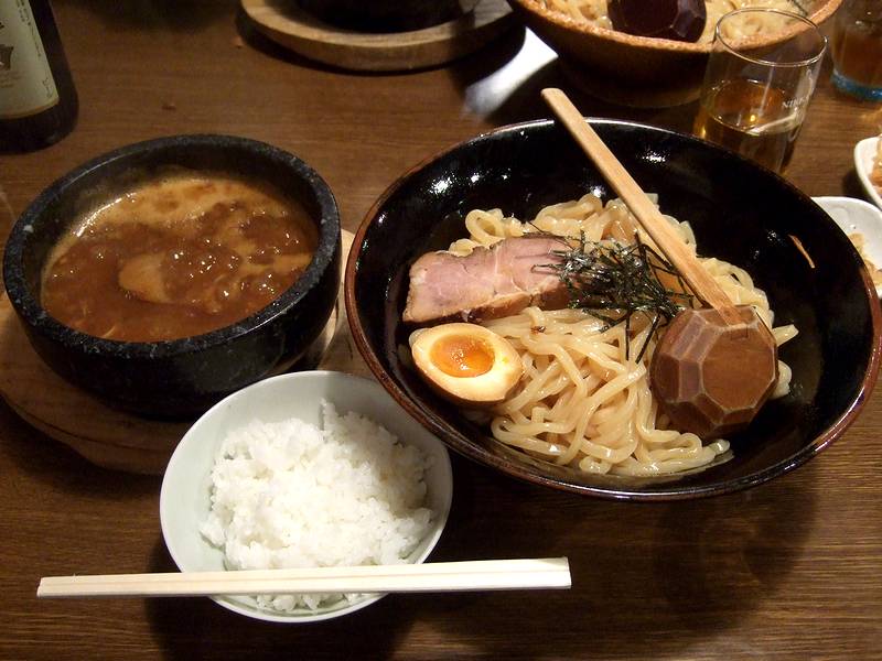 出てきたカレーつけめんは、こちらの通常のつけ麺同様、付け汁が石の器で沸騰しており、その付け汁の香りは、まさしくカレーそのものといった感じ。早速具をそこに入れて暖め、極太の麺につけていただくと、うまいです!これはアリですなぁ。付け汁は、スープ自体の旨味も感じられ、刺激も程よく、適度にトロミがあり麺によく絡みます。なんていうか、こちらのお店の付け汁の特徴を残しつつも、上手くカレーのルーにしたという感じでしょうか。極太の麺も、以前いただいた時と比べて、茹で加減のせいか、はたまた麺自体が改良されたのかはわかりませんが、前回のハードな食べ応えよりもずいぶんとソフトめになったように感じました。個人的には、今回のほうが好みでしょうかね。そして最後はスープ割ではなく、付属のライスを付け汁にイン!いやぁ、カレーライスとして食べてもいけますなぁ。