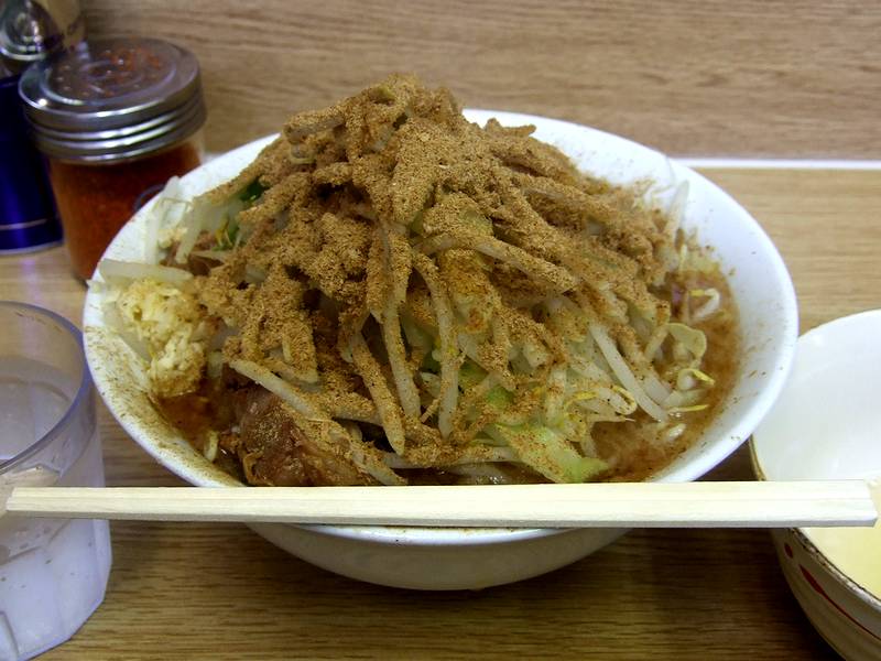 相変わらず行列が続いている二郎栃木街道店ですが、この日も、入店まで約1時間。それで入店していざ食券を買おうとすると、新しく、「かつおくん」というのが加わっており、値段からしてトッピングの類のようなので、小ラーメン及び生たまごの食券と共に購入し、カウンターへ。で、「かつおくんとはどんな物なのかなぁ」と、作るところを見ていると、特に変化のないままトッピングコールのお時間になったので「ニンニク」とコールすると、ニンニクを載せた後、店主さんが両手にステンレス製の調味料入れを両手に持ち、ものすごい勢いで、ラーメンの上に何か茶色い物を振りかけています。