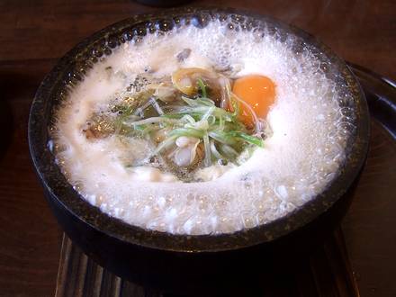まず、あっさり塩ラーメン。透明感があるスープは、あっさり醤油と共通でしょうが、醤油の味と香りがない分、スープの味が良く判りますねぇ。旨味は充分に感じられますが、なんていうか、風通しが非常に良いというか、クリアーな味というか。それに組み合わされる細麺はプリプリ。以前細麺使用のメニューをいただいた時と印象が異なるような気がしましたが、気のせいでしょうかね。具は、天盛りのネギの他、チュルッとした食感がいいワンタンの皮や、お煮染めのようなの味付け(これが結構合ってるんですよ)の椎茸と人参。それと、トッピングで追加した半熟とろ玉が、非常に美味でした。塩加減や火の通し加減がいい塩梅で、卵自体も良質な感じの味です。いやぁ、美味しいですなぁ。そして、ラーメンの後のお楽しみは、噴火めしで。あっさり塩ラーメンのスープがシンプルな分、噴火めしの具の、アサリや海老、コマチャーシューから出た旨味が加わったのが良く判りますね。このスープでも美味しいなぁ。嗚呼、幸せ…。