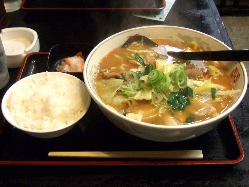 もつ煮込みラーメンは、あっさり目で油の浮いてない味噌ラーメンに、もつ煮込みを大胆に載せてしまったような感じのラーメンでした。というわけで、具は、キャベツともやしの他、もつ煮込みのモツ(脂少なめでトロトロ)・大根・人参・蒟蒻が。麺はシコッとした感じで、カルビラーメンやテグタンラーメンと共通でしょうか?あとこちらのお店らしく、全体的にとってもボリュームがありますが、あっさりとした味なので、最後まで軽く食べられる感じです。それから、途中から卓上の七味やニンニクを入れてみたんですが、特にニンニクは味にパンチが出てとてもよく合いました。