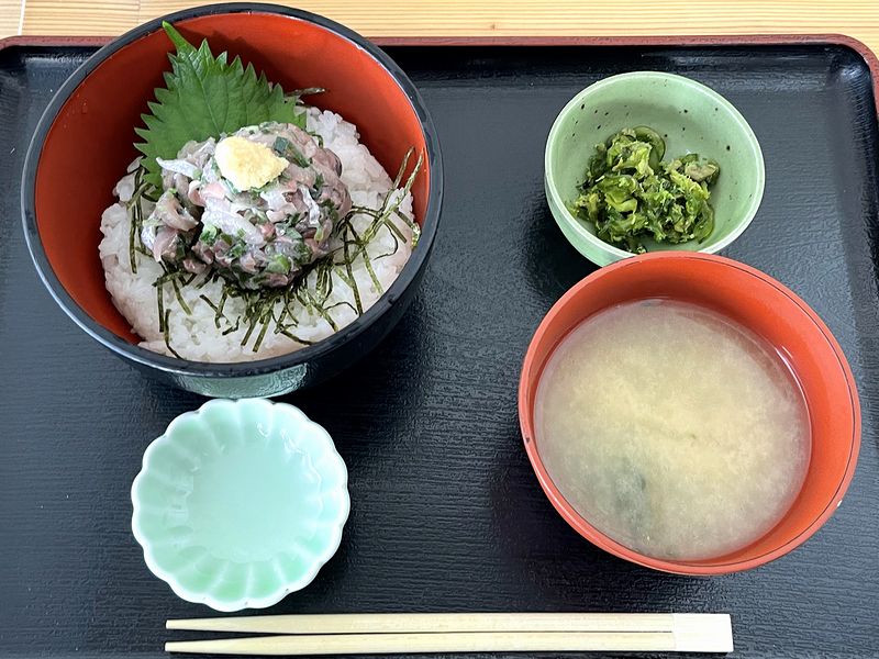 それで食券を出してから、さほど待たずに登場した朝定食。内容は先述のとおりですが、そのアジのたたきが、大葉をあしらい刻み海苔を散らしたご飯の上にこんもりと盛り付けられ、その上におろし生姜が。醤油の小皿もありましたが、そのおろし生姜の上に、卓上の醤油を加減しながら掛けたのち、たたきと軽く混ぜてからいってみれば、これが。