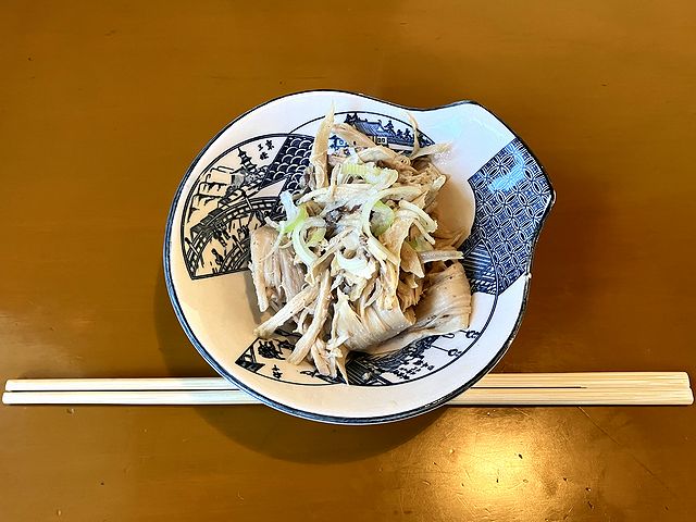 その食券を店員さんに渡し、サービスで出してくださる、スープを取った後のと思われる鶏ガラをつまみつつ、待つこと少しで、今回いただく品々が登場しました。