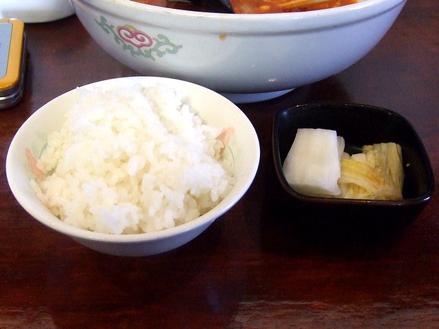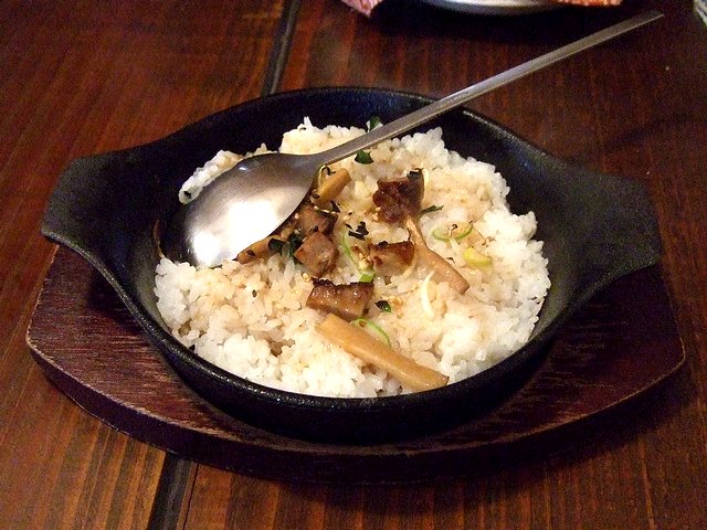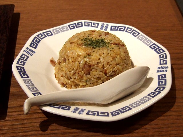 それから、小さい焼きめしは、熱々の鉄の容器に入って登場。ご飯の上に、小間切れのチャーシューと、メンマ、ネギ、ゴマが載り、そこに甘辛のタレがかかっていました。スプーンで混ぜていただくと、お焦げが香ばしくて美味しいです。それにしてもこのタレの味、どこかで味わったことがある気がするんですが、どうも思い出せません…。