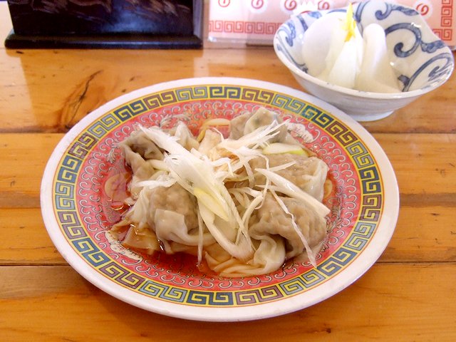 皿ワンタンは、大ぶりのワンタンが5粒。笹切りのネギと、どこか焼き鳥を思わせる風味のタレがかかっています。中の餡は肉主体でミッチリとした感じ。おかみさん餃子がレギュラーメニューになったので、前に比べて頼む人は少なくなった気がしますが、こちらも美味しいサイドメニューだと思いますよ。