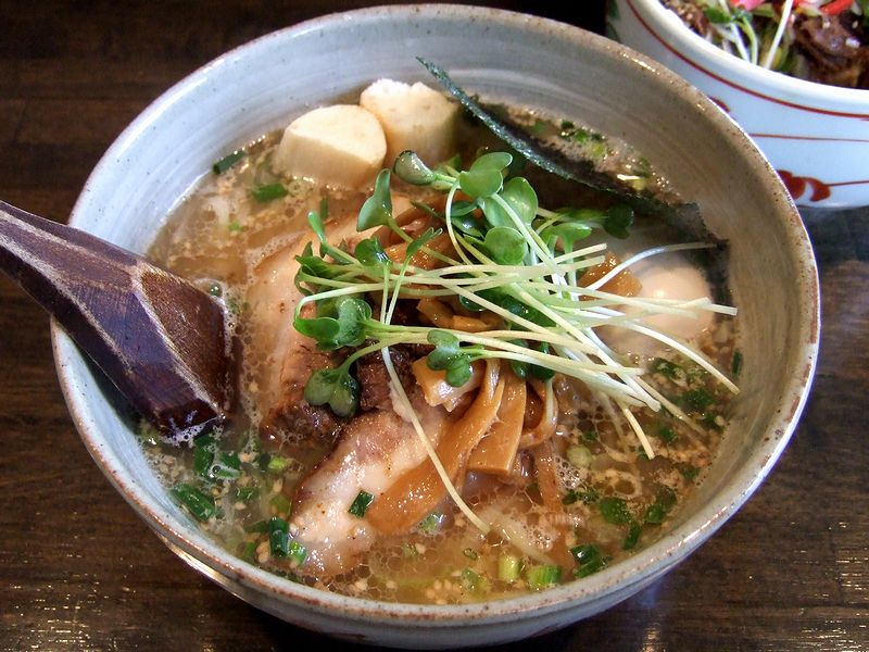 アットプラスラーメンは、メニューの説明どおり、煮干しの風味がビンビン効いてますね。メニューには"あっさり"と謳っていますが、物足りなさは全くありません。むしろ、煮干しの他に動物系の旨味も濃厚な感じ。 輪切りの白ネギと柚子の薬味も合っていて、いやぁ、美味しいです。また、「バカうま」のと違うチャーシューは、トロトロで、控えめの味付けがスープと合いますなぁ。そしてツルツルして柔らかめの麺は、アットプラスラーメン用のオリジナルとのこと。それにしても、本店の「バカうま」とはスープも麺も具も違うはずなのに、どこかしら共通する雰囲気がありますね。