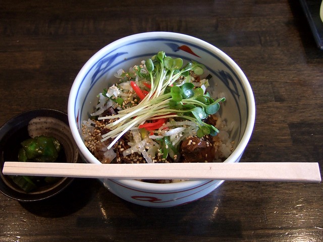 チャーシュー丼は、以前いただいた時と見た目や味の印象が違う気がしました。でも、甘じょっぱい濃厚なタレ(ワサビのような風味がしたような…)が絡んだ柔らかいチャーシューに、ネギとカイワレが清涼感をプラスして、以前いただいた時よりも気に入りました。
