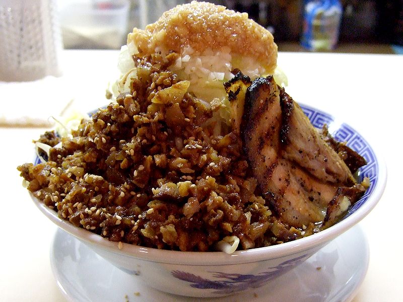 そして待つことしばしで、インパクトのある見た目のラーメンが登場!それほど大きくない丼に、具が山のようになってます。これに、噂に聞く「野菜タワー」や「バカ豚」を足したら、いったいどんなになってしまうのでしょう。で、まず、野菜を掻き分け強引にレンゲを浸し、脂のたっぷり浮いたスープをいただいてみると、これがとっても、「濃い」!!豚骨ベースに魚風味のスープと聞いていましたが、魚風味は控えめな感じで、濃厚な豚骨と脂などの味に、キツめの塩加減。いやぁ、味もインパクトありますなぁ。そして、野菜(モヤシとキャベツ)と麺に「喰らいつく」(カウンターが高いので余計そう感じる)と、シャキシャキの野菜や太くて歯応えのある麺が、味の濃いスープにによく合ってます。その頂点に載せられた、ニンニク(刻んでタレ?に漬け込んである)を混ぜると、更にインパクト増加。トッピングの豚ほぐしも濃いめに味付けされており、それが全体に混ざりだすと、また更にインパクト増加。