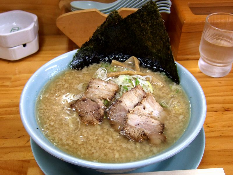 店舗入り口の、とってもメニューが多くて迷ってしまう券売機で、榛名麺(沖町店オリジナルらしいと聞いたので)と豚ほぐしの食券を買うと、店員さんにカウンターに案内(既にお冷やスタンバイ済み)されました。それで実は、前の記事の清華軒さんとの連食だったので無料サービスの中盛(麺100g増量。壁に貼られたメニューでは+50円となってました)はせず、ニンニク(大丈夫かどうか尋ねられました)をお願い。