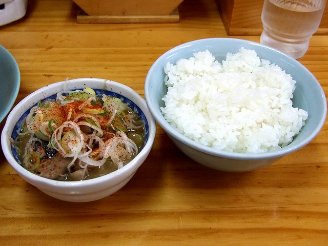 それから、壁に「モツ煮はじめました」と貼り紙がしてあったのでつい一緒にいただくことになった季節限定のモツ煮は、脂っこくないものの、しっかりとした味付け(やや甘みも効いてます)に、多めに降られた一味がパンチを加え、ご飯が進みます。