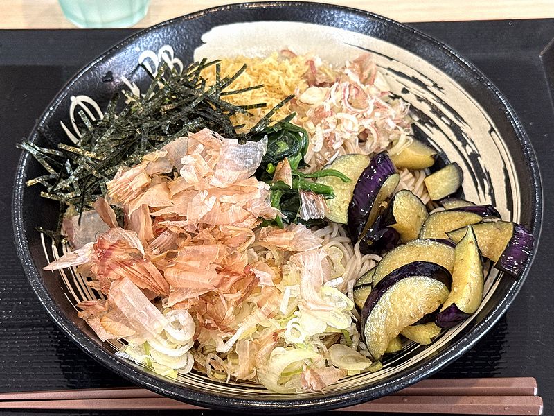 ぶっかけの冷たい蕎麦の上には、ネギ、ミョウガ、刻み海苔、鰹節といつたガチ薬味勢に加え、天かす、ホウレン草、そしてナスといった、まぁ、薬味といえば薬味だよね勢が一面に載っています。