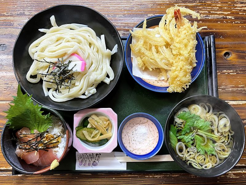 【本日のおすすめセット(えびと新玉ねぎの天ぷらうどん(煮込み)+ミニまぐろ丼) 1,200円】