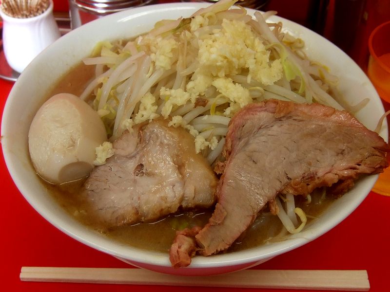 お店には、開店時間の数分前に到着したのですが、既に10人くらいの行列が。そしてお店が開いて入店すると、二郎同様まずは食券購入。メニューはらーめん(二郎サイズ)とチビらーめん(通常のラーメンサイズ)、それらの豚入り、そしてトッピングの煮たまごとシンプルで、とりあえず今回はらーめんと煮たまごの食券を購入してカウンターへ。食券購入からラーメンが出てくるまでの流れというか、作り方は、店主さんが二郎で働いたとあってほとんど二郎と一緒。麺茹でにテボで使っていたところが違うくらいでしょうか。そしてコールのお時間になったので、ニンニクとだけお願いしました。