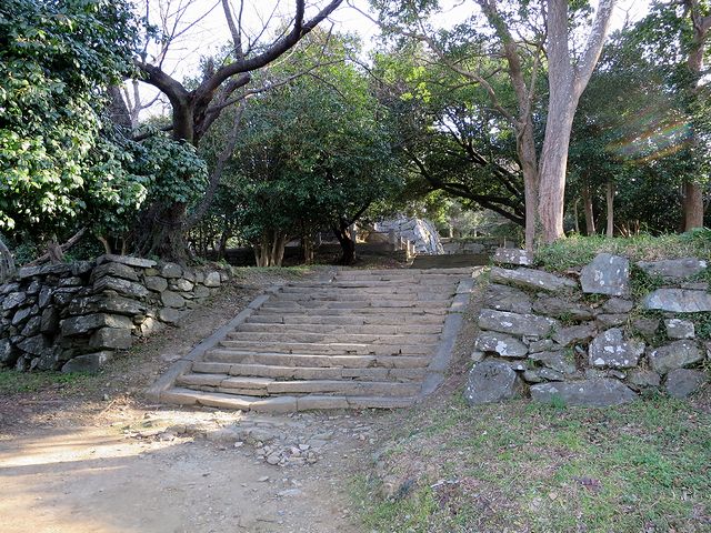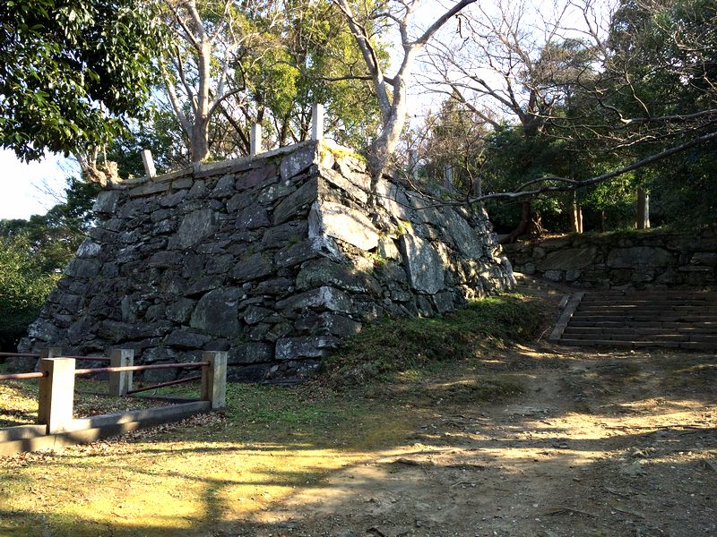 そしてとうとうやって来た本丸跡。結構な広さですね。で、当然のことながらここが城山の一番高いところで、標高は61.7m(麓の案内板より)。また、本丸と呼ばれるだけあって、元々はここに天守が在ったそうなのですが、元和年間(1615~1624年)には取り壊されてしまったそうで。それと、本丸から下方向を見た時に登り石垣らしい遺構を発見したのですが、特に説明板とか無かったので、実際に何なのかはわかりませんでした。(もう少しお城を見るスキルを上げなきゃ駄目ですね…。)