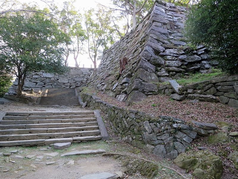西坂口から階段をヒーコラ言いながら登ると、西三の丸に到着。この付近より本丸にかけて、先述の三波川変成岩(緑泥石片岩)が使用された石垣が連続で現れ、結構な見応えです。また三の丸の西側部分は水道施設の城山配水池を作る際一部取り壊されてしまったとのことで。それにしても、市街地にある平山城は、必ずと言って良い程水道の配水池が有りますね。(極めて合理的選択だと思いますが。)