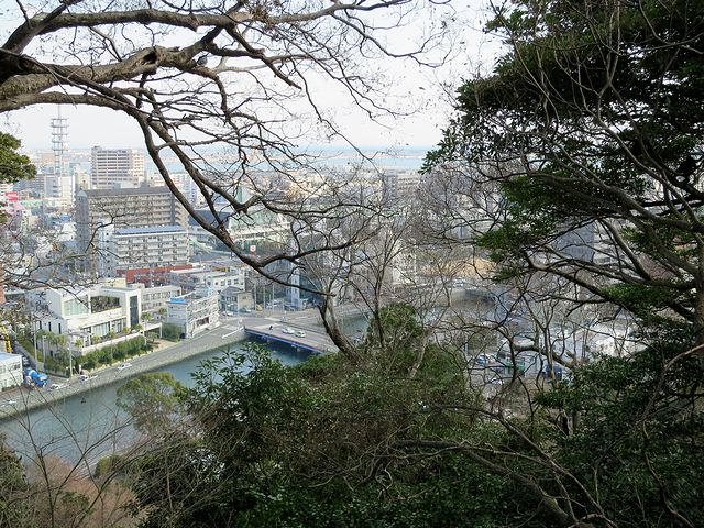 それで駐車場にレンタカーを置いて早速登城といきたいところなのですが、その前にこちらを。駐車場というかお城のある城山のすぐ北側に流れているのが、かつてお城の堀代わりだった助任(すけとう)川。また、そこに接する城山の外縁部の岩肌には、縄文時代早~前期である約5000~6000千年前、ここが海だった事を示す海蝕痕が残っています。また、当地は昔から人跡の有った所らしく、この城山には縄文時代後~晩期の約4000~2300千年前ものと見られる貝塚が見つかったそうで。