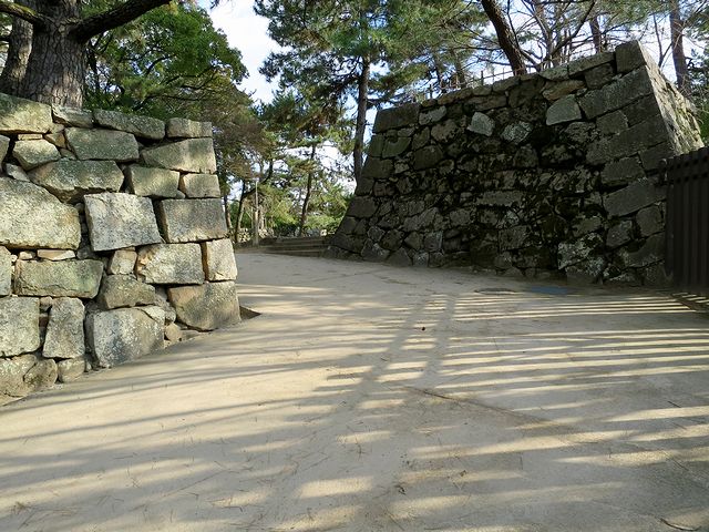それで駐車場に着いた時点でもうお城の中に入っているとは思うのですが、とりあえずは駐車場からも見える天守を目指します。で、テニスコートの脇を通り過ぎると、右手に天守方向へと向かう上り坂が。で、ここを進むと東御門跡というところからいきなり本丸へ。