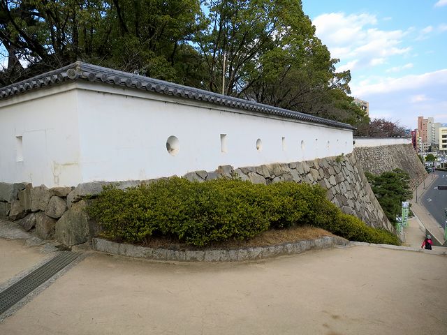筋鉄御門を出ると、JR福山駅と並行するように石垣が続いているのですが、かなりの高さですね。