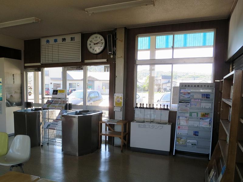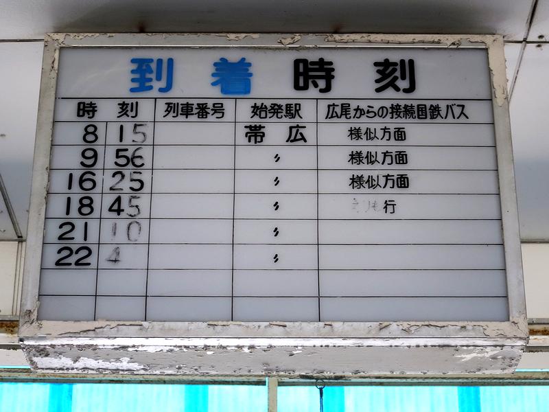 出札口に残る到着時刻表には、廃止時のものと思われる到着時刻が(一部消えかかっているとは言え)まだ残っていました。