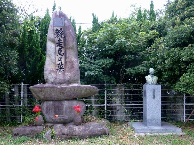 競争馬のお墓と銅像が寄り添うように建っています。で、お墓には近くに咲いていたであろう彼岸花の他、まだそんなに古くなっていないリンゴがお供えしてありました。それと銅像の松隈又五郎さんですが、福岡県飯塚市出身の福岡県議会議員で、戦後、中津競馬場が経営困難に陥った際、私財を投じて援助されたとの由。