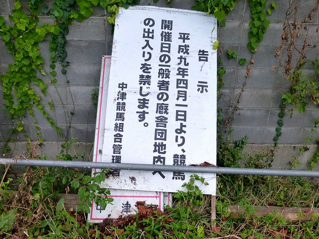 入口付近の、厩舎団地外周のブロック塀のところには、平成9年度より競馬開催日の厩舎団地には関係者以外立入禁止となった旨の告示看板がうち捨てられていました。