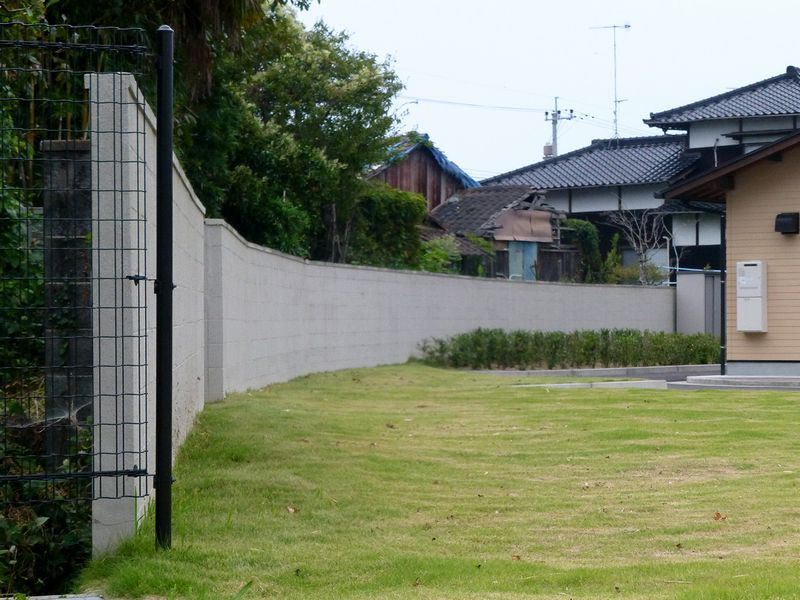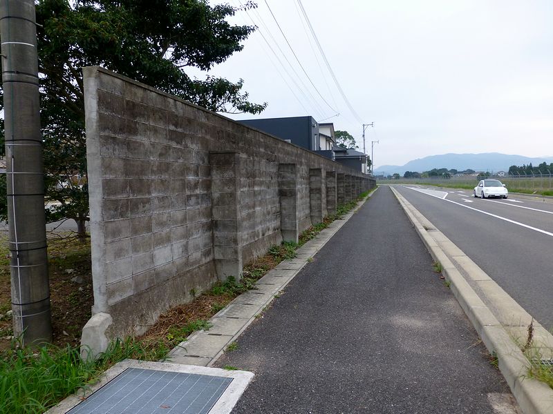 今回見つけることができたコース部分で唯一と言って良い明確な遺構が、大幡コミュニティーセンター付近にある、第1コーナーから第2コーナーにかけての外周ブロック塀。ちなみに、以前、本などで見たものとは色が変わっていました。