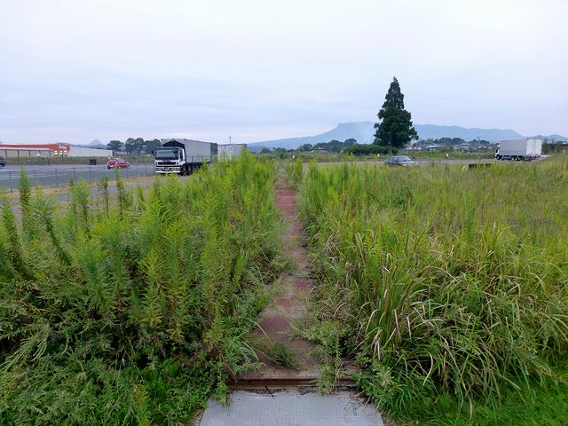 厩舎団地は北北東から南南西方向に長細い形をしていたのですが、こちらはその南端付近と思われる場所。そこから内部を見ると、整備工事の際に出た残土っぽい土砂が再利用すべく仮置きされていました。