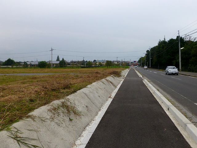 写真は、向正面の途中あたりから第2コーナー方向を見たところ。左の一段高くなっているところが競馬場跡。で、元々、向正面外側の外周に沿って道路があったのですが、よく見ると歩道が真新しいので、そこは競馬場敷地だったところを使って後付けしたんですかね。