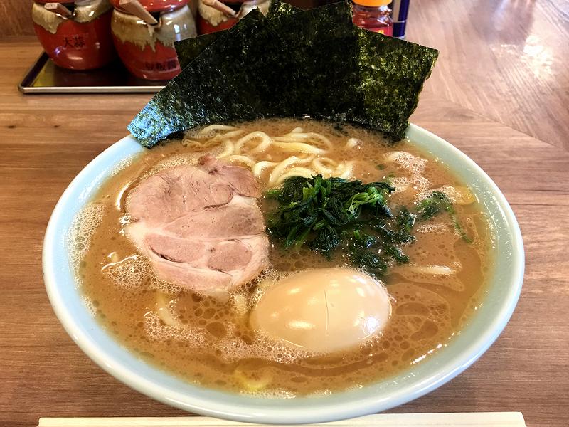 それでこちらのラーメン。早速いただいたところ、表面の鶏油はまろやかだけど、スープ自体にはキレがあります。このコンビネーション、かなりやりますね。また味の濃さは、「普通」で頼んでも若干濃いめに感じましたが、逆にこのくらいの方が丁度良いです。そして麺は、固さ「普通」で頼んでも若干固目に感じましたが、これがこちらの普通ということでいただけば、モチムチっとした食感が悪くないです。あとチャーシューは、若干ハムっぽい感じもしましたが柔らかい仕上がりで、いい塩梅の味玉は黄身の中心部がトロトロ。それと、卓上の調味料も一通り試してみたのですが、豆板醤やニンニクといった家系では一般的なものの他、おろしショウガが珍しく感じました。で、これらを若干固めに炊かれたライスと共にいただけば、もう、たまりませんね。