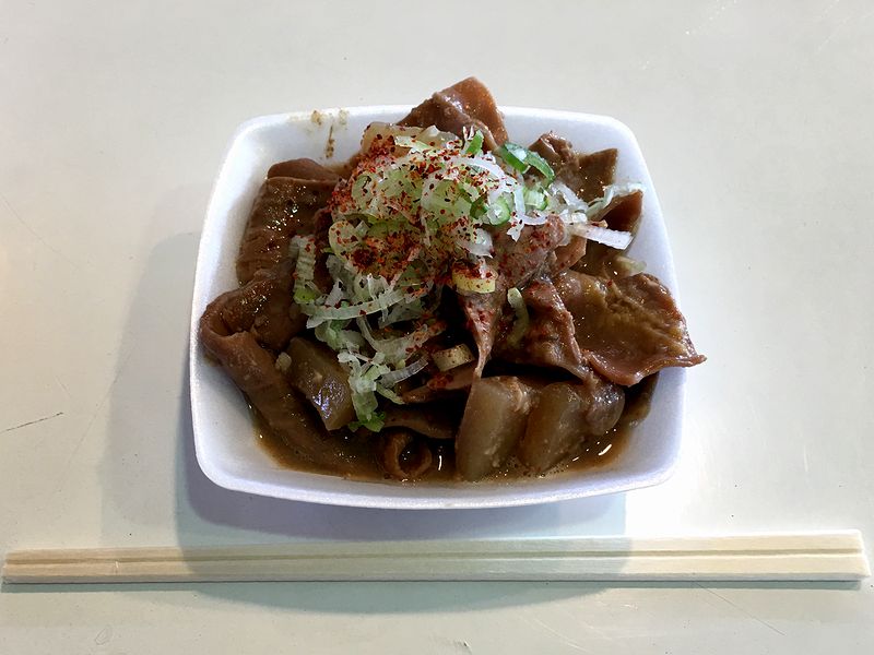 で、店名からしてお店の看板商品と思われるこちらの品。実は前回も(立喰の方で)いただいたのですが、牛白(大腸)と蒟蒻というシンプルな構成なれどその味は深みがあってまろやか。やっぱり旨いです。