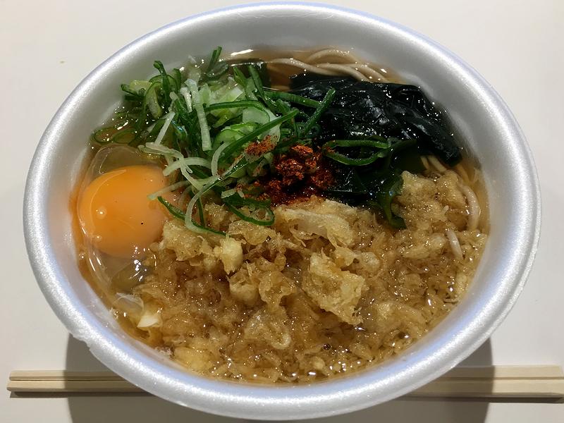 それで時系列的には今回競馬場で最後にいただいたのが、こちらのそば。ちなみに「スタミナ」と付くそば・うどんはお店によって具の違いが大きい気がするのですが、こちらのは生玉子と天かす、そしてワカメという組み合わせでした。それでそのお味は、つゆにダシ感はあまりないけど、醤油っ気、塩気とも濃いめで良く、そこにたっぷり入る天かすがコクをプラス。また、ソバは細めでわりと歯応えが。総じて、美味しくいただきました。