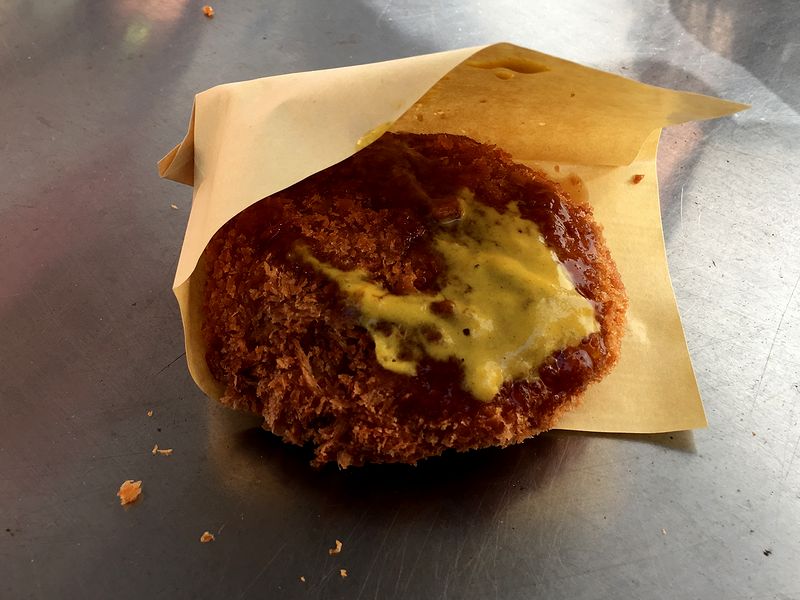 ですが、今回あえていただいたのがこちらの品。私がセンスなくかけたソースとマスタードの所為で残念な見た目になってしまいましたが、お味の方は、タマネギ?の甘味と豚肉が相まって、また肉汁も結構ジューシーに感じられ、これがなかなか。個人的にメンチカツは好物なのですが、素直に旨いと思いました。