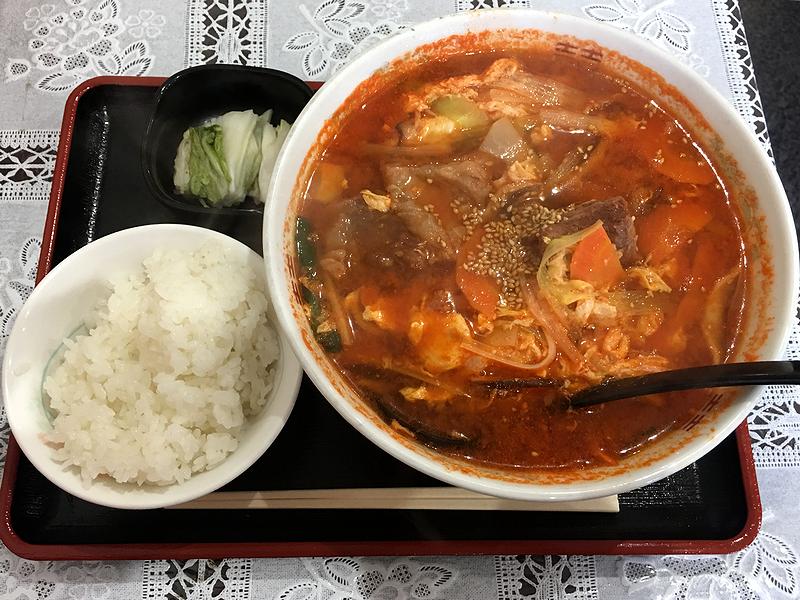そんな中、以前も良くいただいていたこちらの品を。ベースはあっさりしているのに、ゴロゴロっと入るトロトロのカルビやたっぷりの野菜類、そして香辛料などで深みのある風味や旨味が加わって、そこにちょっとだけ甘味も効いた良い加減の味付けは記憶どおりの旨さ。また以前は辛さの表記が小辛・普通・中辛・大辛・激辛の5段階となっていたと思ったのですが、今は0辛(辛さ無し)~7辛(地獄)の8段階になっているんですね。で、以前は大辛や激辛をいただいていたので今回もそのあたりをいきたかったのですが、体調がイマイチだったこともあって標準の3辛(辛いのok)でお願いしたところ、これが個人的にはピリ辛程度に感じました。それでまずはムチモチの太縮れ麺を啜り、その後は小ライスを投入して堪能すれば、もう。