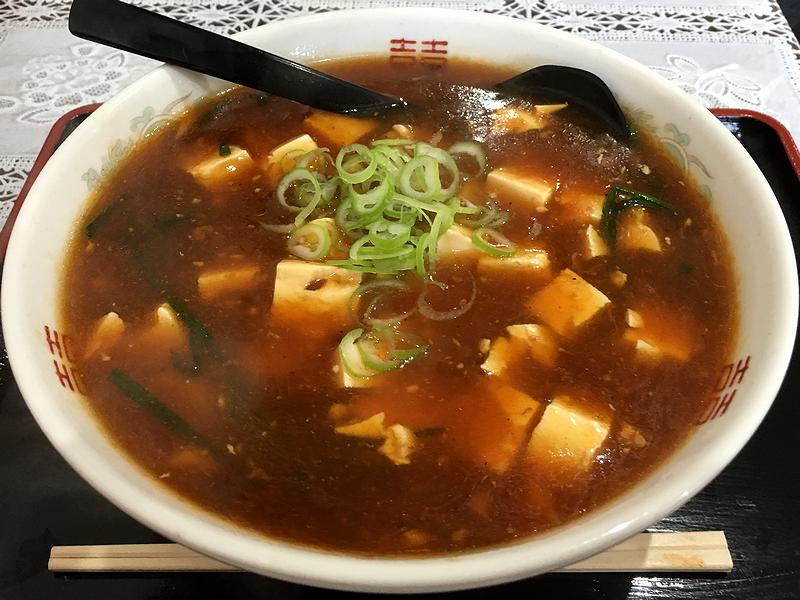 こちらは、同行者がいただいたもの。ちなみに、隣の卓のマダム(お婆さん)3人組がこの品を揃って注文していたのですが、一部で流行っているんですかね。で、少々味見させて貰ったのですが、ごま油の香りが印象的。辛味に唐辛子のダイレクト感がなかったので、ラー油に使われているごま油の香りでしょうか?。ちなみに、辛さは標準で2辛(チョイ辛)となっていましたが、まさしくそんな感じで。また麻婆が上に掛かっているという感じではなく、スープ全体トロトロなタイプ。麺は細麺で、やさしめの味でした。