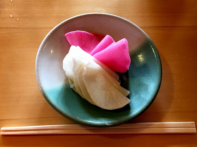 注文を済ませると登場するサービスの大根の甘酢漬けは、今年も紅白の正月バージョン。個人的に、これをいただくと正月を実感するようになりました。