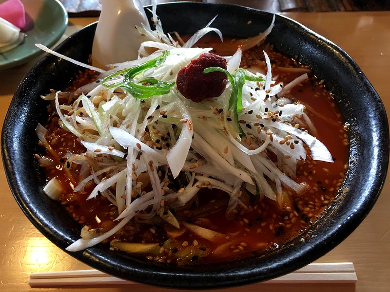 それでラーメンは、ここ暫くのあいだ毎年正月にいただいている、期間限定のこちらの品。実際にはもっと前から販売されているんですが、個人的に正月にいただくのが恒例となってしまいました。で、今年のはどんなかなぁ、と期待を膨らませつつ、てっぺんの味噌玉以外をよく混ぜていただけば、まず感じるのは色々な「香り」。自家製味噌、唐辛子、具の白ネギなどに、噛むとはじけるゴマの香ばしさは、どれもフレッシュというか鮮烈というか。そしてスープのコクと旨味、味加減はほどよく、唐辛子の辛さも(個人的には)辛すぎなく適度。ムチモチとした太縮れ麺は、最初の頃ニラを練り込んでいたのですが、現在のバージョンではどうなんでしょうか?もっとも、そんなのは関係なしに、小麦の味がちゃんとして、スープと良く合う麺だと思いますが。それと具は、モヤシやニラと野菜がメインですが、十分に肉も感じます。そして途中から、取っておいた味噌玉をスープで溶いて全体に混ぜれば、味がより一層キマりますね。最後はライス投入で、一スープ滴も残さずに完食いたしました。