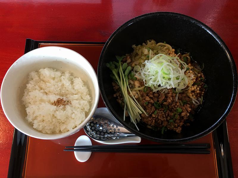 それがこの、本場、成都式のタレに、辛味と痺れが強い四川漢源花椒を用いたという汁なし担々麺の正宗担担麺。別に最初の訪問の際にいただいても良かったのですが、こちらのお店で最も辛いメニューであることに敬意を表して、段階を踏んでまいりました。で、登場してまず気付くのは、その四川漢源花椒由来と思われる、よりフルーティーで爽やか、そして鮮烈な香り。更に、いただく前に全体をよく混ぜ混ぜする際、その何とも良い香りが立ち上ってきます。そして頃合いを見て一口いってみたところ、流石は本場式というか、前述の香りに加えて、胡麻ではなく醤油ベースの味付けが、まろやかではあるけどガツンと来て、あとは上に載ったそぼろというか肉味噌のコク、あられやピーナッツの香ばしさ、白ネギの葷(くん)香、ザーサイの発酵味などが混ざり合った、しょっぱいけれども深い味わいが素直に美味いです。で、最初はそれほど感じなかったものの、旨い旨いといただいている間に、口には辛味が、そして痺れが蓄積しだして、もう!!特に痺れは強烈で、唇がヒーヒージンジンとい感じになり、食後暫くの間痺れ続けているようでした。そんな中、麺を食べ終わり、残ったタレの中に半ライスを投入。すると、白ご飯のプレーンな甘さによって、口の中の辛味が若干中和。最後まで美味しくいただくことが出来ました。