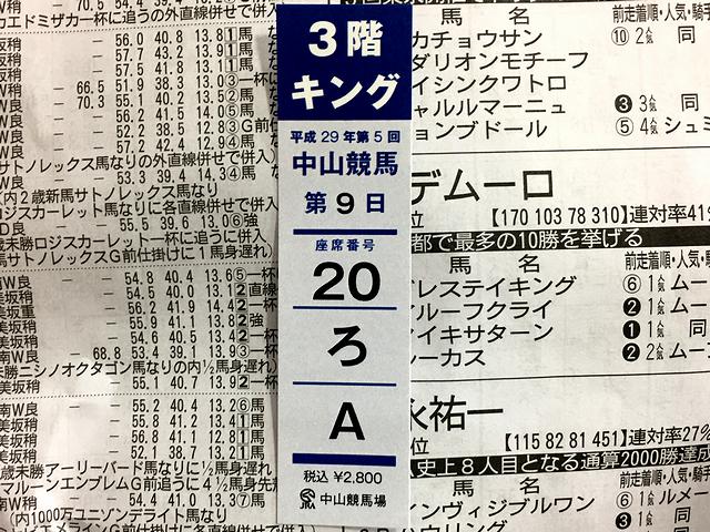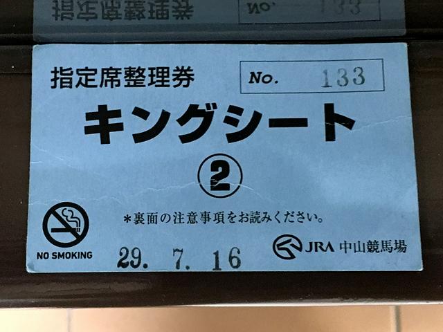 発売開始から20分以上(30分近く掛かったかも)経って、ようやく窓口へ。で、今更ながらキングシート1と2の違いですが、1の方が若干ゴール及びパドックに近い模様です。そこで窓口に来た時点で後寄り及び最前列の席は売り切れていたため前から2列目の席をゲット。そういえば窓口で指定席券を買う場合、JRAカード持っていても支払いは現金のみとなるんですね。そしてとりあえず自席に向かい席に落ち着きましたが、2回目となるキングシート(ちなみに1回目はこちら)は快適。席が広くて仕切りもあるので隣を気にしなくて良いし、卓上にパソコンと専門紙広げても余裕があるのも良いです。