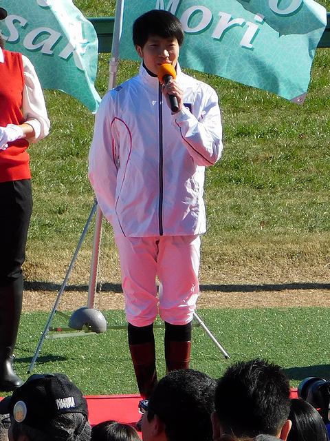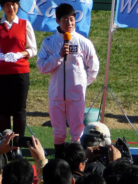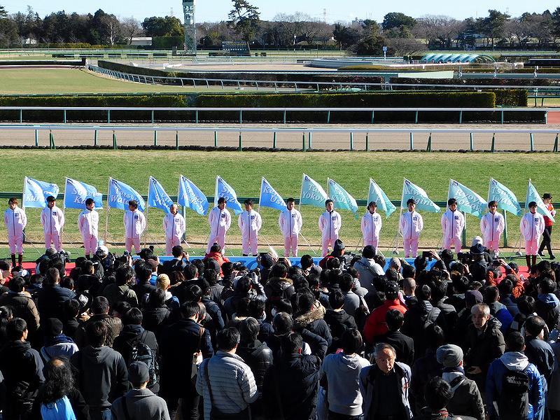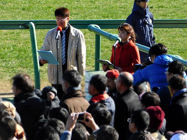 まずは、第4レース終了後に出場騎手紹介を兼ねたオープニングセレモニーが。ちなみに司会は、グリーンチャンネルの『中央競馬全レース中継』やホッカイドウ競馬の実況などでお馴染みの坂田博昭アナウンサーと、グリーンチャンネルの『先週の結果分析』や楽天競馬のCMなどでお馴染みの津田麻莉奈さん。で、出場騎手紹介の後、代表してトライアルラウンドでの上位4人の騎手が意気込みを語り、最後は集合写真という感じだったのですが、風が強い中、皆さんかなり寒そうでした。